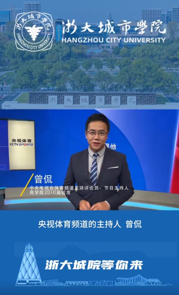 中央电视台体育频道足球评论员、节目主持人,商学院2010届校友曾侃寄语考生:选择浙大城市学院,选择未来更美好的成长!