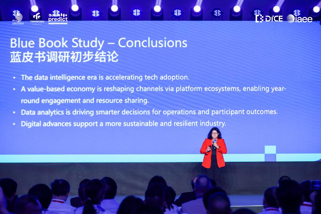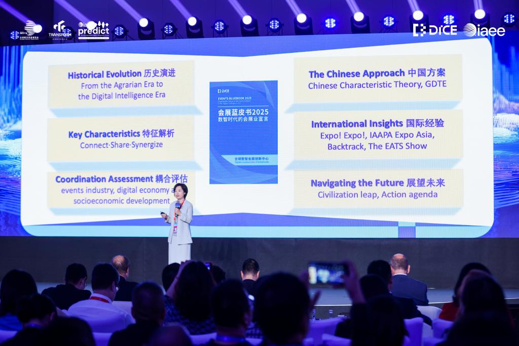 活动现场,浙大城市学院国际文化旅游学院副院长、全球数智会展创新中心研究部主任吕佳颖,美国展览业研究中心(CEIR)研究副总裁 Nancy Drapeau一起发布了由全球数智会展创新中心(DICE)编写完成的《会展蓝皮书 2025:数智时代的会展业宣言》。