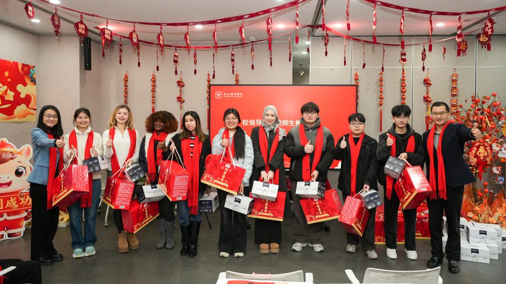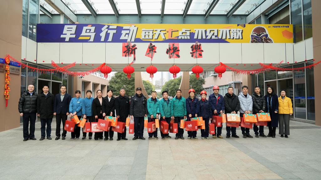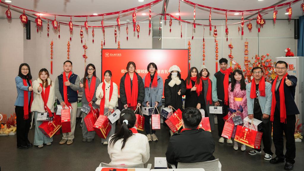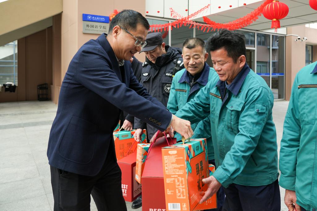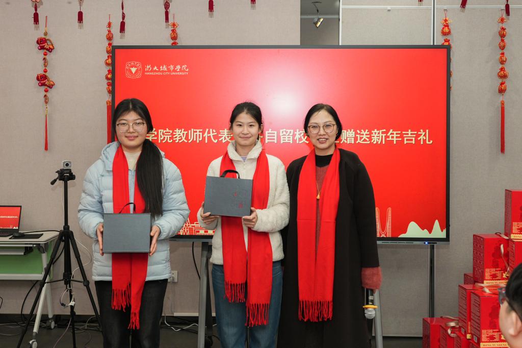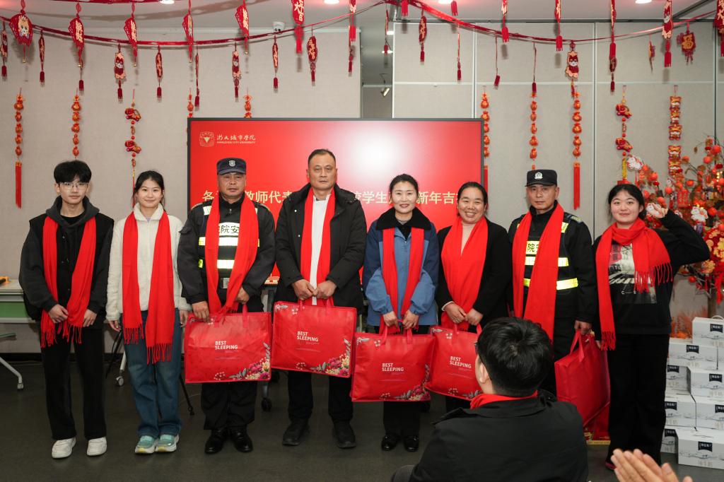 各学院教师代表为留校学生送上贴心的新年吉礼,学子们也向守护校园的后勤、安保员工代表表达了真挚感谢。校领导向留校人员赠送了满载祝福的慰问品,将学校的关怀送至每个人手中。