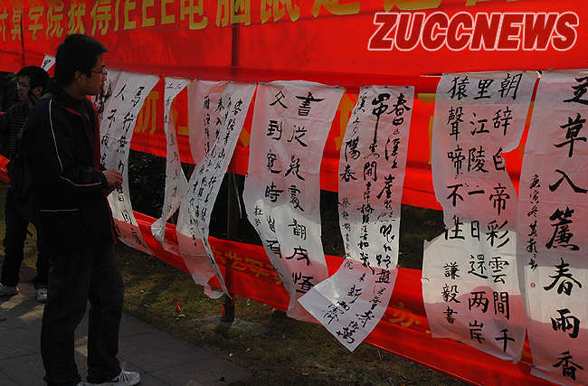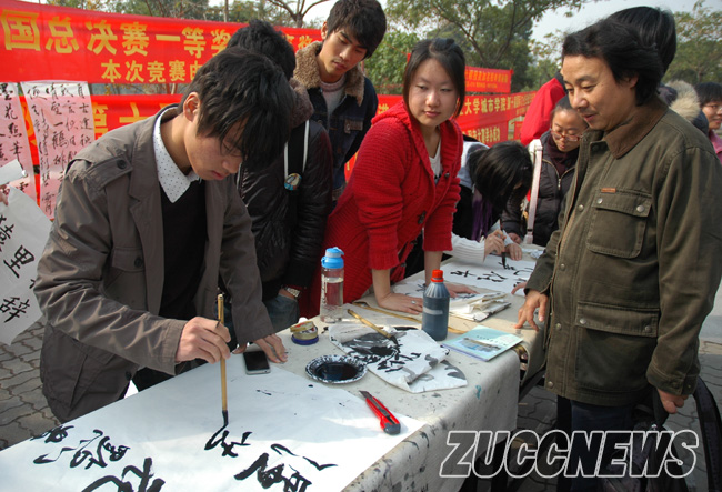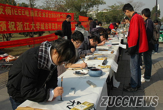 桌子依次排开,一群有着相同爱好的学生聚集在一起,俯首挥毫泼墨。今天中午,浙江大学城市学院“墨韵城院”新生现场书画大赛在风雨操场前进行,吸引了不少同学驻足欣赏。书画协会会长周子钰同学表示,现在喜欢和了解书画艺术的人越来越少,希望以此能让更多的同学们近距离感受书画的魅力。