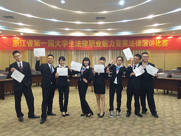 2014年浙江省第一届大学生法律职业能力竞赛之法律演讲比赛由浙江省教育厅、浙江省大学生科技竞赛委员会主办,历经网评初赛和现场决赛两个阶段。当时法学院所推荐的九位同学都成功地通过了初赛得以进入决赛,所有参赛队中有此表现的仅有两所学校。决赛中每位选手均在赛前30分钟抽取赛题,然后作即兴演讲,围绕“法律必须被信仰”、“法治,和谐社会的基石”、“正义从来都不会缺席”三个赛题,最终取得了4个一等奖,4个二等奖的优异成绩,位居参赛院校前列。