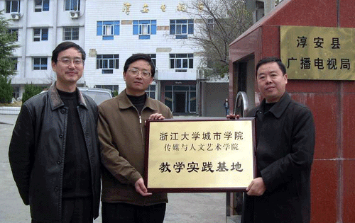 浙江大学城市学院传媒与人文艺术学院千岛湖“教学实践基地”日前成立。至此,传媒学院已先后在温州、舟山、湖州、丽水、台州、衢州等地建立了近20个教学实践基地。图为12月21日,传媒学院副院长王玉生与淳安县广播电视局郑星副局长和洪善富副局长共同为淳安实践基地挂牌。