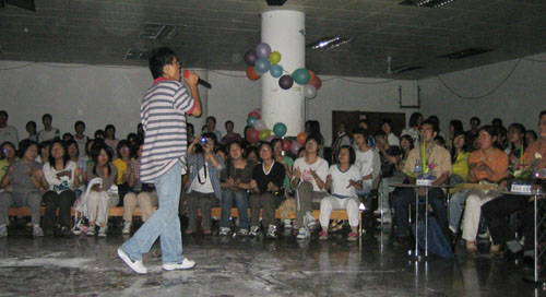 9月23日晚,学院体育馆二楼热闹非凡,歌声飘扬,舞姿翩跹,欢声笑语不绝于耳,原来生科学院2005级新生迎新晚会正在这里进行。分院总支副书记、副院长沈王兴、副院长宋志芳和部分老师,以及分院200多名05级新生参加了晚会。