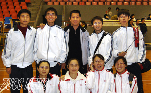 在日前结束的2005年浙江省大学生羽毛球比赛中,首次参赛的城市学院队遇到了包括浙江大学、浙江工业大学、浙江师范大学、杭州师范学院等传统强队。队员们在领队应圣远、教练郑岩平的悉心指导下,不畏强手,团结拼搏,最终获得男子团体第七名,女子第八名,在总共20所高校中获得了比较理想的名次,这对于首次参加这项比赛的城市学院而言,已是难能可贵。图为城市学院参赛运动员与教练合影。(学工委)