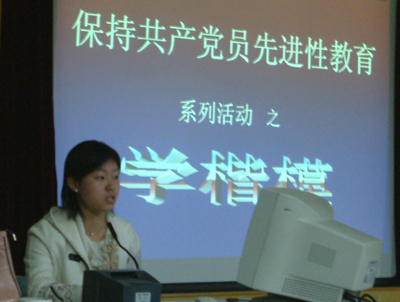 12月4日晚,城市学院传媒学院保持共产党员先进性教育系列活动之“学楷模”在教一举行。分院大一、大二所有学生党员及部分入党积极份子参加活动。高年级学生党员徐飞介绍了“2003年感动中国十大年度人物”之一的山西运城纪检委副书记、原山西夏县纪委书记梁雨润的事迹,同学们还观看了《梁雨润先进事迹报告会》实况录像。