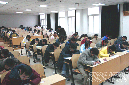 城市学院期末考试目前正在如火如荼地展开,一万多名学生潜心复习,沉着应考。据了解,今年学院安排的考试近1200场,考试时间为12天,场次多、周期密,给考务工作带来很多压力。但在学院的精心安排和师生的努力下,考试进展顺利。图为某考场一角(王鹏)