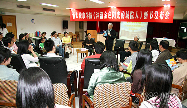 浙大城市学院前任院长鲁世杰新著《沐浴金色阳光的城院人》日前由浙江大学出版社出版发行。4月28日,城市学院新闻中心举行了新书发布会。城市学院院长王立人发来贺信,对该书的出版发行表示祝贺。学院党委副书记斯荣喜应邀出席发布会并宣读王院长贺信。书中写到的19位城市学院学生参加了发布会或发来贺信。城市学院部分师生自发参加了发布会。图为鲁世杰老师介绍新书来历。