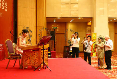 城市学院艺术团的器乐分团承担了本次晚会的演出任务,一共演出了8个精彩的节目,其中有民乐重奏和独奏等不同形式的乐器演奏。表演主要以中国传统民乐为主,一曲由琵琶、二胡和扬琴三重奏的《彩云追月》拉开了演出的序幕,营造了现场良好的音乐氛围。葫芦丝独奏的一曲《月光下的凤尾竹》和柳琴独奏《破浮的港》吸引了许多外宾,他们惊叹葫芦丝和柳琴这两种乐器的优美旋律,仿佛听到了天籁之音,纷纷起立观看演出并给演员回馈了最热烈的掌声。扬琴独奏《在水一方》成为演出的高潮,金惟同学高超的技艺和投入的表演,使悠扬的琴声与柔美的音乐配合得恰倒好处,许多外宾纷纷站出来摄像,拍照并不断竖起大拇指。传统的古筝独奏《浏阳河》和《渔舟唱晚》也同样得到了晚会嘉宾的认可和赞许。另外,两首由小提琴独奏的西洋音乐《神秘园》和中国民乐《渔舟唱晚》在民乐为主打的演出中成为另一个亮点。